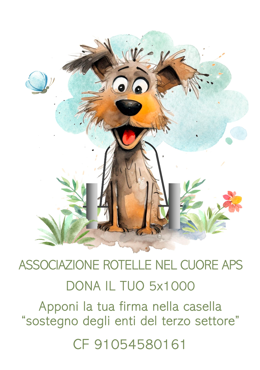 Donando il tuo 5x1000 offri ai Rotellini un aiuto all'acquisto di prodotti a loro dedicati come cibo, giochi, medicine, garze, antiparassitari, salviettine, tele cerate e molto altro; oltre che a permettergli di ricevere le migliori cure mediche e una continua manutenzione degli ausili ortopedici.