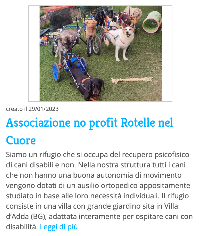 Con questa donazione puoi offrire a tutti i nostri Rotellini un aiuto all'acquisto di prodotti a loro dedicati, cibo, giochi, acquisto e manutenzione dei supporti ortopedici.