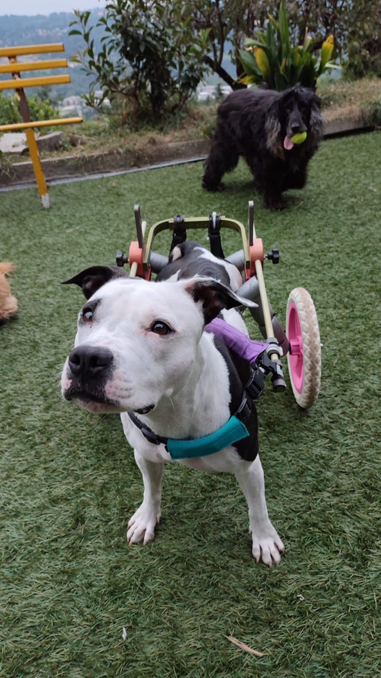 Nella nostra struttura tutti i cani che non hanno una buona autonomia di movimento vengono dotati di un ausilio ortopedico studiato appositamente in base alle loro necessità ma non pensare che siano limitati nella loro disabilità, carrellino o no, la loro curiosità e voglia di vivere è nettamente superiore ai limiti fisici imposti dalla disabilità!
